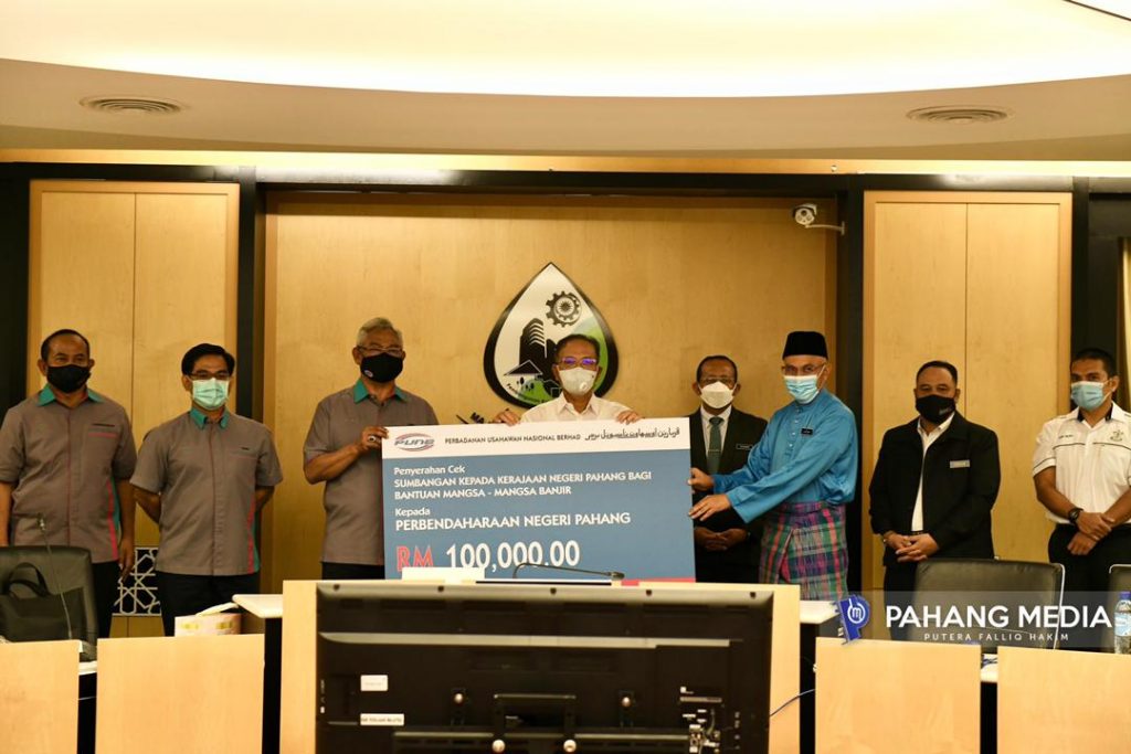BENTONG, 29 JANUARI 2021: Kerajaan Pahang hari ini menerima sumbangan berjumlah RM100,000 daripada Perbadanan Usahawan Nasional Berhad (PUNB) untuk Tabung Khas Bencana Banjir Negeri Pahang bagi membantu penduduk terjejas banjir.