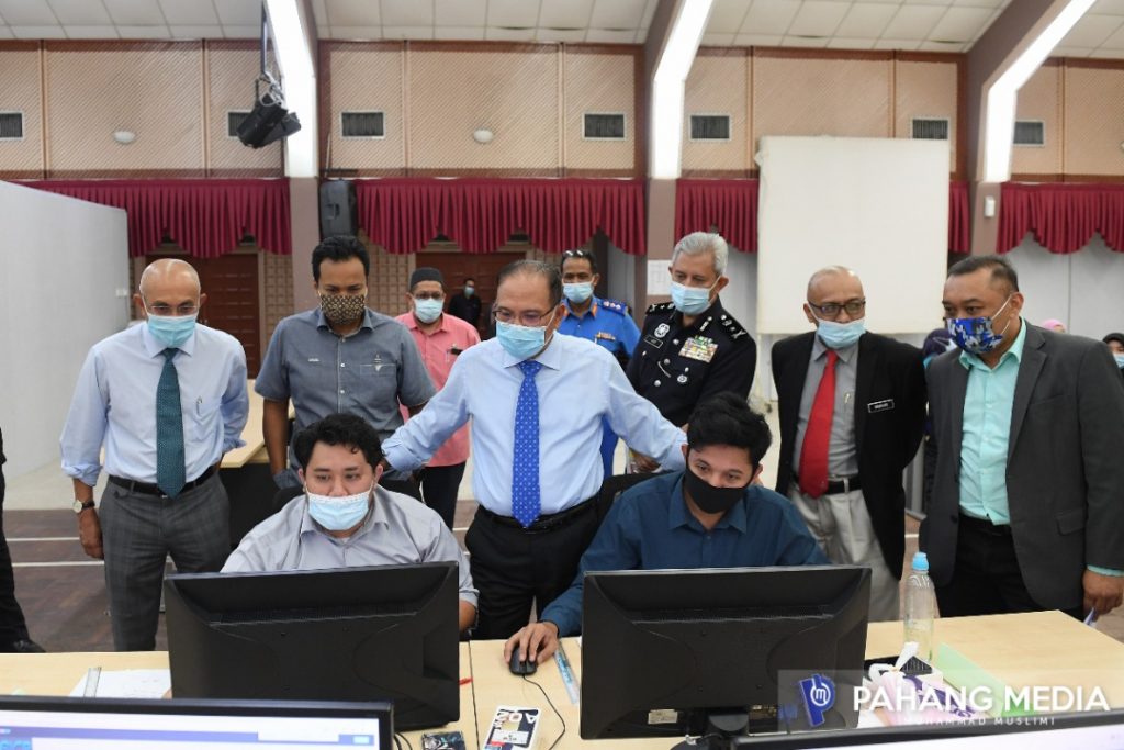 Beliau juga turut meluangkan masa untuk melawat Pusat Operasi Vaksin Negeri Pahang di Blok C Bangunan Setiausaha Kerajaan Pahang bersama YB. Setiausaha Kerajaan Pahang, Dato’ Sri Dr Sallehuddin Ishak serta kepimpinan pasukan Task Force COVID-19 Negeri Pahang. -PAHANGMEDIA