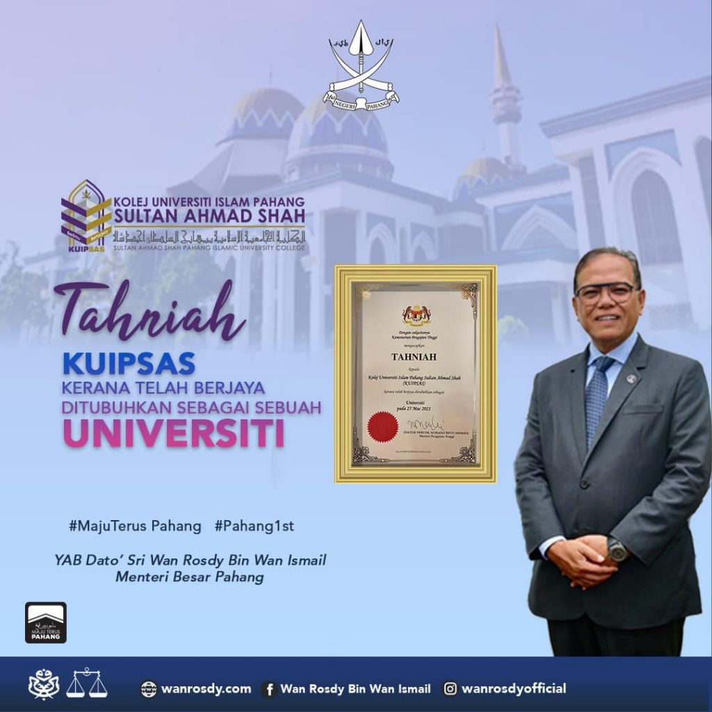 KUANTAN, 30 MAC 2021: Kolej Universiti Islam Pahang Sultan Ahmad Shah (KUIPSAS) telah diiktiraf sebagai sebuah universiti oleh Kementerian Pengajian Tinggi Malaysia.