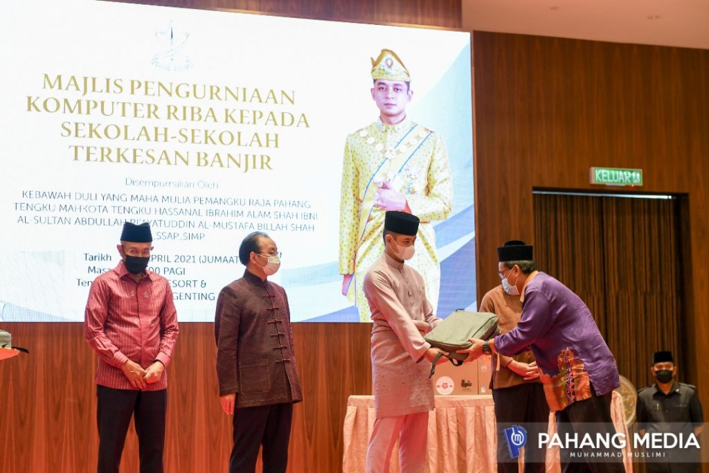 BENTONG, 9 APRIL 2021: Kebawah Duli Yang Maha Mulia Pemangku Raja Pahang Tengku Mahkota Tengku Hassanal Ibrahim Alam Shah Ibni Al-Sultan Abdullah Ri’ayatuddin Al-Mustafa Billah Shah berkenan menyempurnakan Majlis pengurniaan komputer riba sumbangan Yayasan Al-Sultan Abdullah (YASA) kepada sekolah-sekolah terkesan banjir di Genting Highland di sini hari ini.