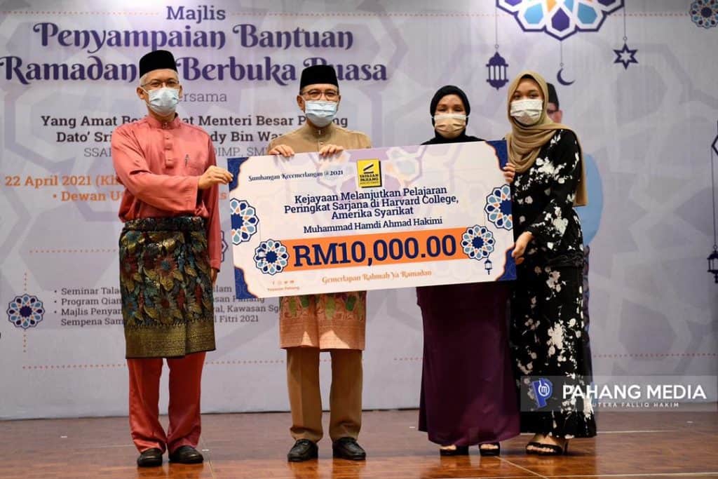 KUANTAN, 23 APRIL 2021: Kejayaan Muhammad Hamdi Ahmad Hakimi, 20, yang dipilih melanjutkan pengajian ke Harvard College di Amerika Syarikat turut mendapat perhatian Kerajaan Pahang yang tampil menghulurkan sumbangan berjumlah RM10,000.