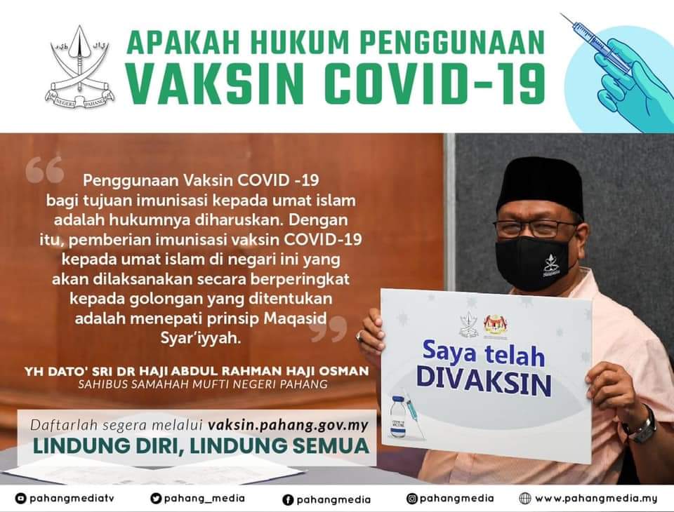 Itu seruan Sahibus Samahah Mufti Negeri Pahang, Dato’ Sri Dr. Abdul Rahman Osman kepada semua Islam di Pahang supaya mendaftar untuk mendapatkan suntikan vaksin bagi memutusan rantaian COVID-19.