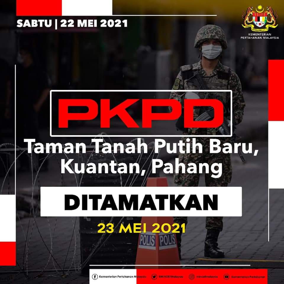 Setelah membuat penilaian risiko bersama pelbagai agensi dalam Jawatankuasa Teknikal PKP dan atas nasihat KKM, Kerajaan bersetuju menamatkan PKPD di Taman Tanah Putih Baru, Kuantan, Pahang pada 23 Mei 2021 lebih awal daripada yang dijadualkan.