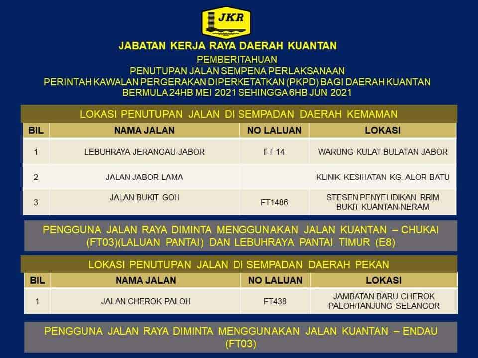 “Keseluruhan laluan masuk ke Daerah Kuantan telah didirikan sekatan jalan raya (SJR) termasuk beberapa laluan alternatif yang ditutup sepenuhnya iaitu Jalan Jabor-Jerangau; Jalan Jabor Lama-Alor Batu; Jalan Felda Neram-Bukit Kuantan; dan Jambatan Tanjung Selangor- Cherok Paloh,” katanya.