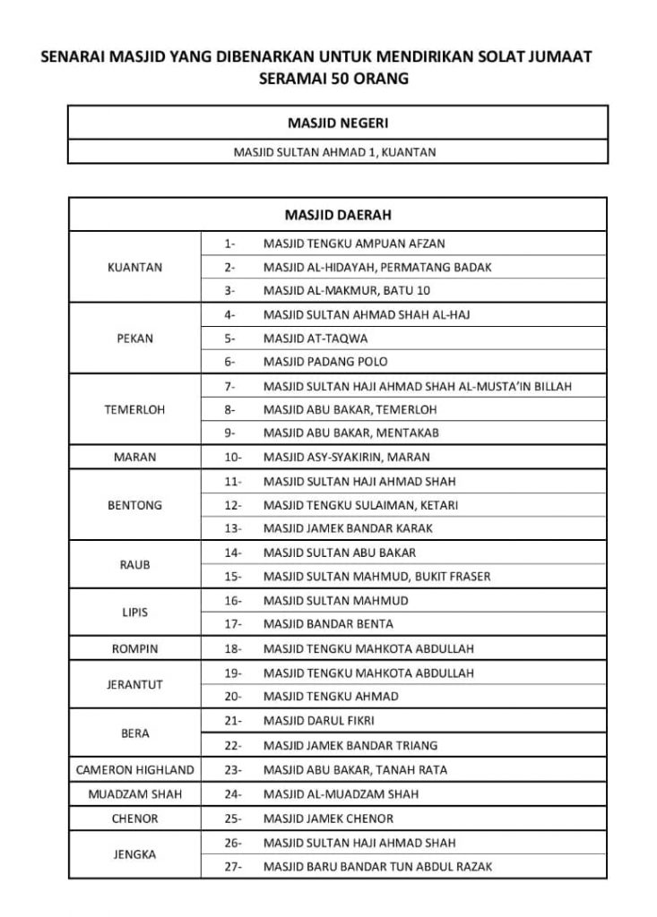 Pengarah Jabatan Agama Islam Pahang (JAIP), YH. Dato’ Dr. Haji Zulkifle Haji Ali Al-Hafiz berkata, pelaksanaan itu selaras dengan keputusan Jawatankuasa Perundingan Hukum Syarak yang telah diperkenankan oleh Kebawah Duli Yang Maha Mulia Seri Paduka Baginda Yang di-Pertuan Agong, Al-Sultan Abdullah Ri’ayatuddin Al-Mustafa Billah Shah Ibni Al-Marhum Sultan Haji Ahmad Shah Al-Musta’in Billah serta Kebawah Duli Yang Maha Mulia Pemangku Raja Pahang Tengku Mahkota Tengku Hassanal Ibrahim Alam Shah Ibni Al-Sultan Abdullah Ri’ayatuddin Al-Mustafa Billah Shah dengan persetujuan muktamad tiada masjid yang ditutup.