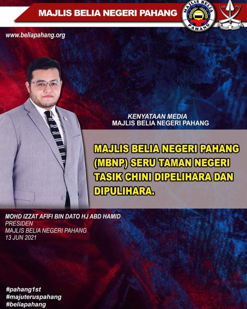 “MBNP juga percaya komitmen Kerajaan Negeri untuk mewartakan Taman Negeri Tasik Chini seluas 4,600 hektar sebagai Hutan Simpan Chini dan tiada kelulusan baru diberikan untuk operasi perlombongan seperti diputuskan oleh Majlis Mesyuarat Kerajaan (MMK) pada 13 Mac 2020 adalah manifestasi keprihatinan serta kepedulian Kerajaan Negeri kepada pemeliharaan dan pemuliharaan alam sekitar dalam negeri ini.
