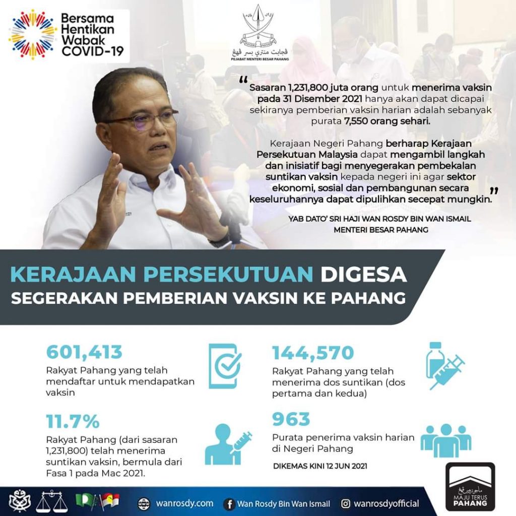 YAB Menteri Besar Pahang, Dato’ Sri Haji Wan Rosdy Wan Ismail berkata, sehingga 12 Jun 2021, hanya 11.7 peratus rakyat Negeri Pahang (dari sasaran 1,231,800 juta) telah menerima suntikan vaksin bermula dari Fasa 1 yang bermula pada Mac 2021.