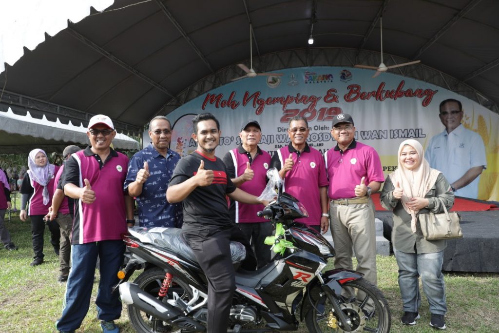 Pengerusi Jawatankuasa Pertanian dan Industri Asas Tani dan Bioteknologi Pahang, YB. Dato’ Sri Ir. Haji Mohd. Soffi Tan Sri Abd. Razak (tengah) bersama pemenang cabutan bertuah pada Program Moh Mengemping dan Berkubang 2019 di Padang Awam Kampung Padang Tua di sini.