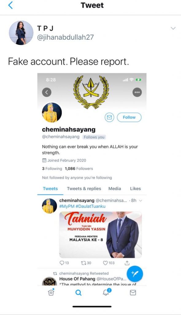 KUANTAN, 2 MAC 2020: Satu akaun Twitter palsu menggunakan nama Kebawah Duli Yang Maha Mulia Seri Paduka Baginda Raja Permaisuri Agong Tunku Hajah Azizah Aminah Maimunah Iskandariah Binti Almarhum AlMutawakkil Alallah Sultan Iskandar Alhaj dikesan diwujudkan sejak malam tadi.