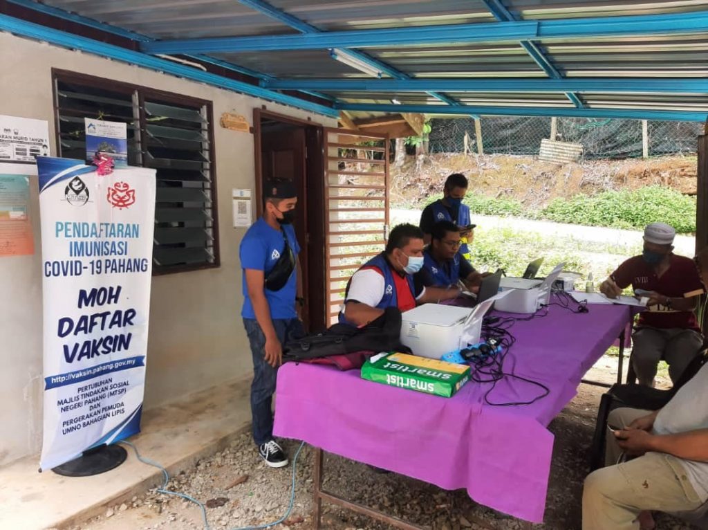 Sukarelawan MSTP membantu mendaftar vaksin penduduk.