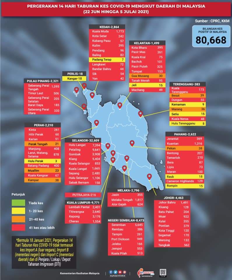 COVID-19 : LAPAN DAERAH BERADA DALAM ZON MERAH, SATU JINGGA, DUA KUNING HARI INI