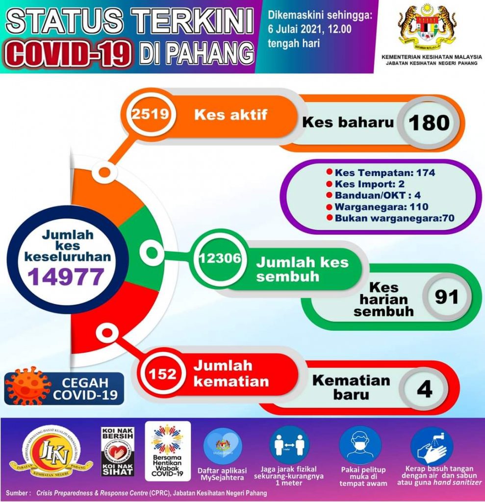 KUANTAN, 06 JULAI 2021 : Terdapat empat kes kematian baharu dilaporkan di negeri ini hari ini dengan tiga daripadanya berkaitan kluster aktif.
