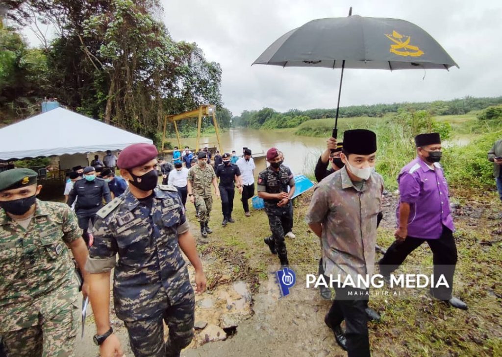 Baginda yang diiringi YAB Menteri Besar Pahang, Dato’ Sri Haji Wan Rosdy Wan Ismail kemudiannya mendengar taklimat dari Jabatan Pengairan dan Saliran (JPS) berkenaan keadaan air sungai berkenaan.