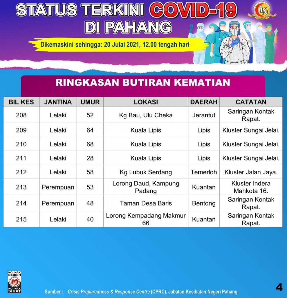 Pengarah Kesihatan Jabatan Kesihatan Negeri Pahang (JKNP), Dato’ Dr. Haji Bahari Dato’ Tok Muda Che Haji Awang Ngah dalam satu kenyataan media berkata ini menjadikan jumlah kumulatif kematian di Pahang meningkat kepada 215 kes.