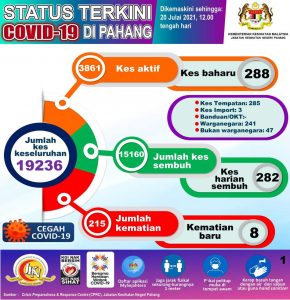 KUANTAN, 20 JULAI 2021: Terdapat lapan kematian akibat COVID-19 dilaporkan di negeri ini hari ini dengan lima kes daripadanya berkaitan dengan tiga kluster aktif.
