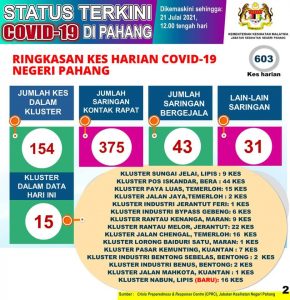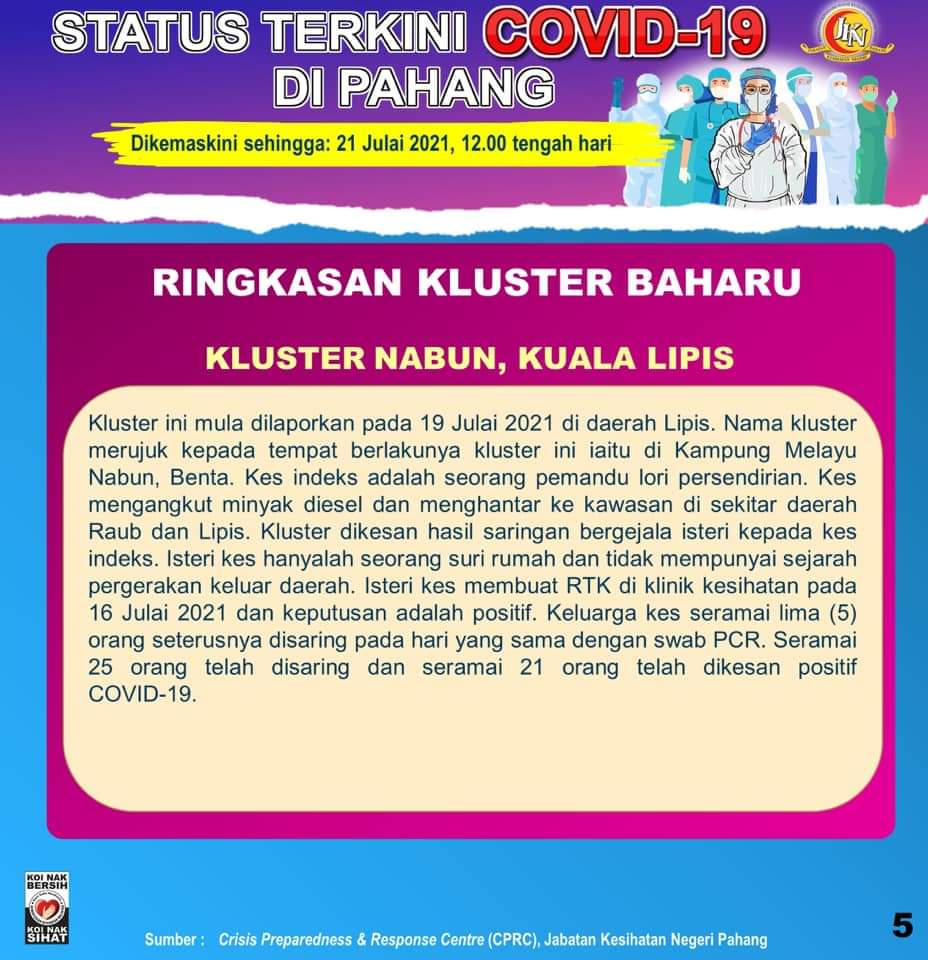 KUANTAN, 21 JULAI 2021 : Terdapat satu kluster baharu dilaporkan hari ini di Lipis dengan 21 individu dikesan positif COVID-19.