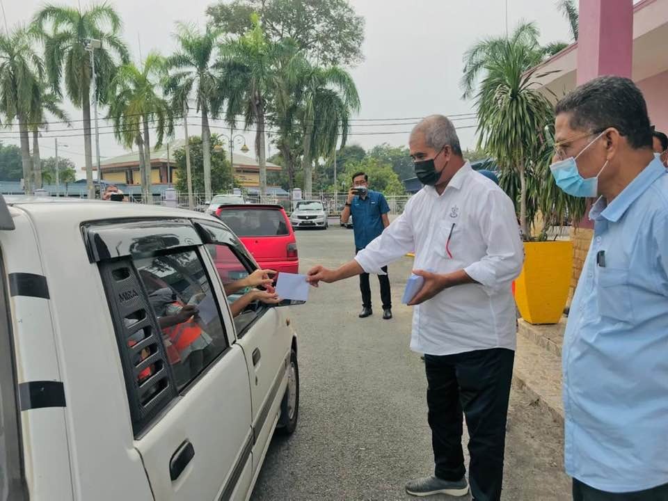 Pengerusi Jawatankuasa Hal Ehwal FELDA, Koperasi, Usahawan dan Hal Ehwal Pengguna Negeri Pahang, YB. Dato’ Haji Nazri Ngah menyampaikan sumbangan Bantuan Prihatin Pahang (BBP) kepada seorang penerima secara pandu lalu.