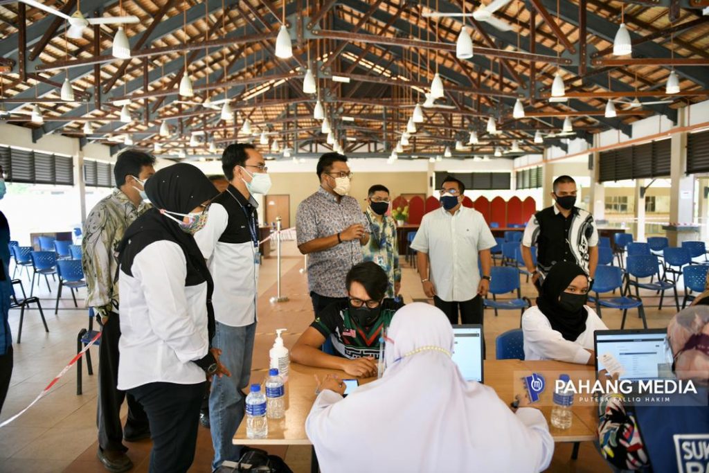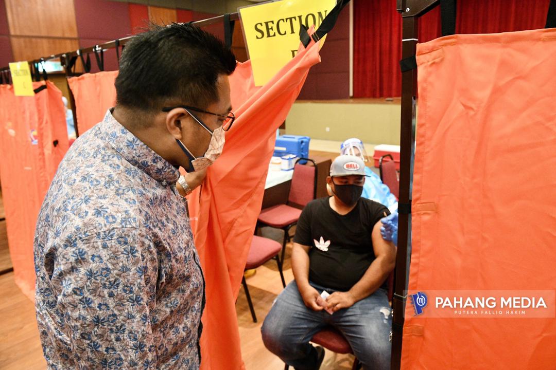 Pengerusi Jawatankuasa Pelancongan, Kebudayaan, Alam Sekitar, dan Perladangan dan Komiditi Negeri Pahang, YB. Dato’ Sri Mohd. Sharkar Shamsudin melihat proses suntikan vaksin ketika melakukan tinjauan di Pusat Pemberian Vaksin (PPV) Institut Latihan Memperkasakan Ummah (ILMU), Janda Baik, Bentong hari ini.