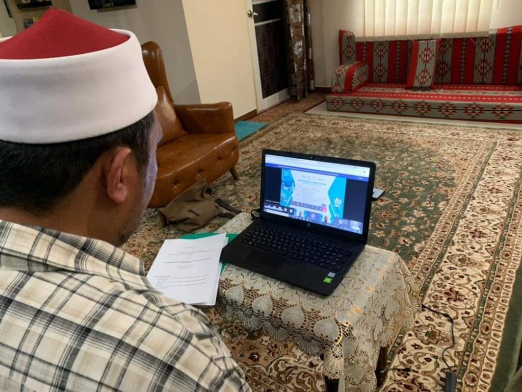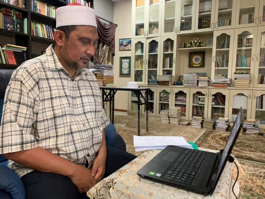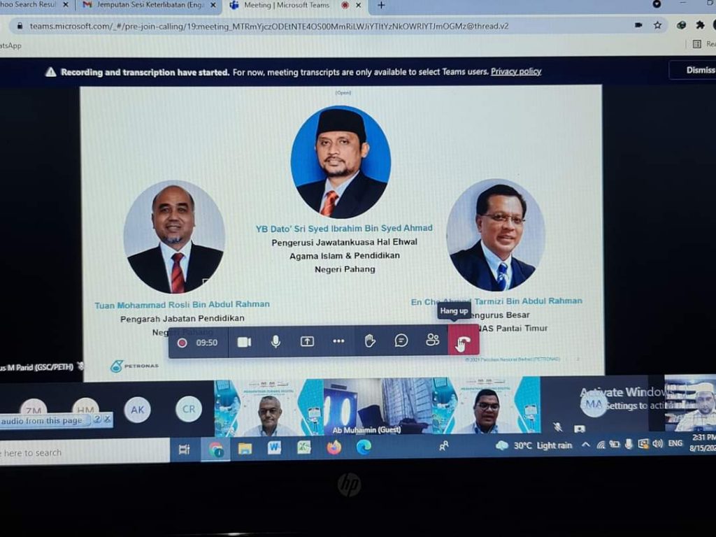Pengerusi Jawatankuasa Hal Ehwal Agama Islam dan Pendidikan Negeri Pahang, YB Dato’ Sri Syed Ibrahim Syed Ahmad ketika sesi pertemuan secara maya bersama Pengurus Besar PETRONAS Pantai Timur, Encik Che Ahmad Tarmizi Abd. Rahman hari ini.