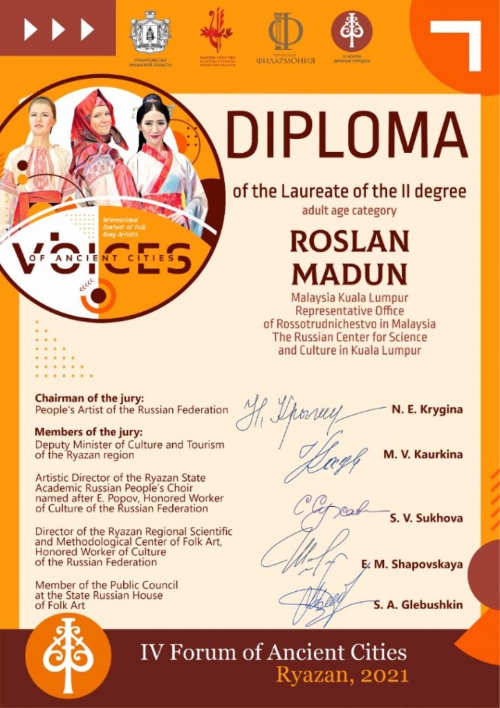 “Disebabkan pandemik, pertandingan ini diadakan melalui video yang dikirim melalui Kedutaan Russia di Malaysia kepada urusetia di Ryazan di mana dua video lagu Seloka Pak Kaduk dan Seloka Pak Pandir telah dihantar dan saya mendapat Laureate of the II degree, iaitu gelaran atau pencapaian yang diiktiraf oleh penganjur,” katanya ketika dihubungi Unit Komunikasi dan Media Pahang (UKOMP).