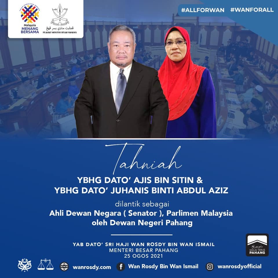 “Saya ingin merakamkan ucapan terima kasih kepada YAB Menteri Besar Pahang, Exco-exco serta rakan-rakan seperjuangan yang memberi kepercayaan kepada saya sehingga dicalonkan sebagai Senator.