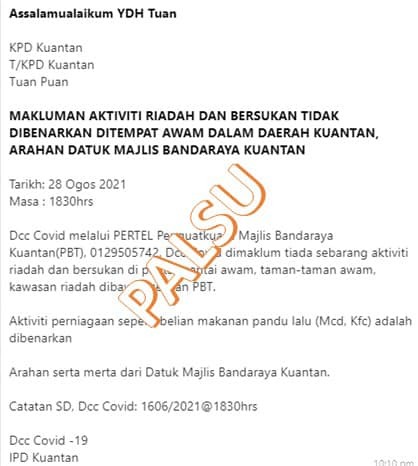 Sebelum ini telah tular mengenai satu laporan yang dikeluarkan oleh Ibu Pejabat Polis Daerah (IPD ) Kuantan mengenai makluman aktiviti riadah dan bersukan tidak dibenarkan di tempat awam di dalam daerah ini atas arahan Datuk Bandar.