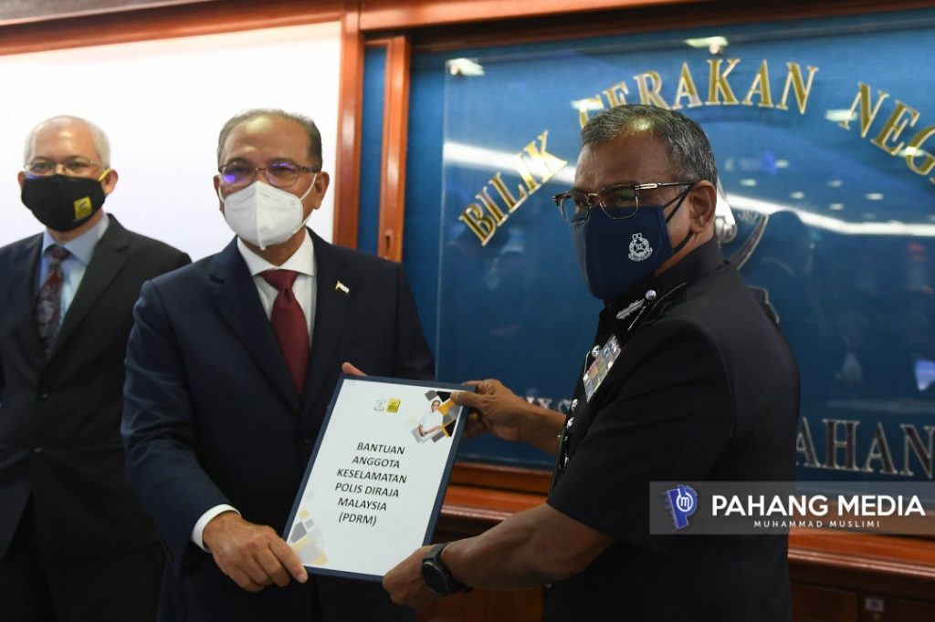 KUANTAN, 1 SEPTEMBER 2021 : Sebanyak 13 keluarga waris kepada anggota keselamatan Polis Diraja Malaysia (PDRM) yang meninggal dunia ketika dalam tugas menerima sumbangan bantuan berjumlah RM72,500 sumbangan Kerajaan Negeri menerusi Yayasan Pahang.