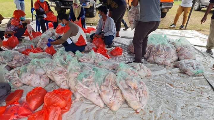 Para sukarelawan membantu membungkus 1,150 ayam segar sebelum diagihkan kepada penduduk terlibat PKPD di Felda Kota Gelanggi 2, Jerantut.
