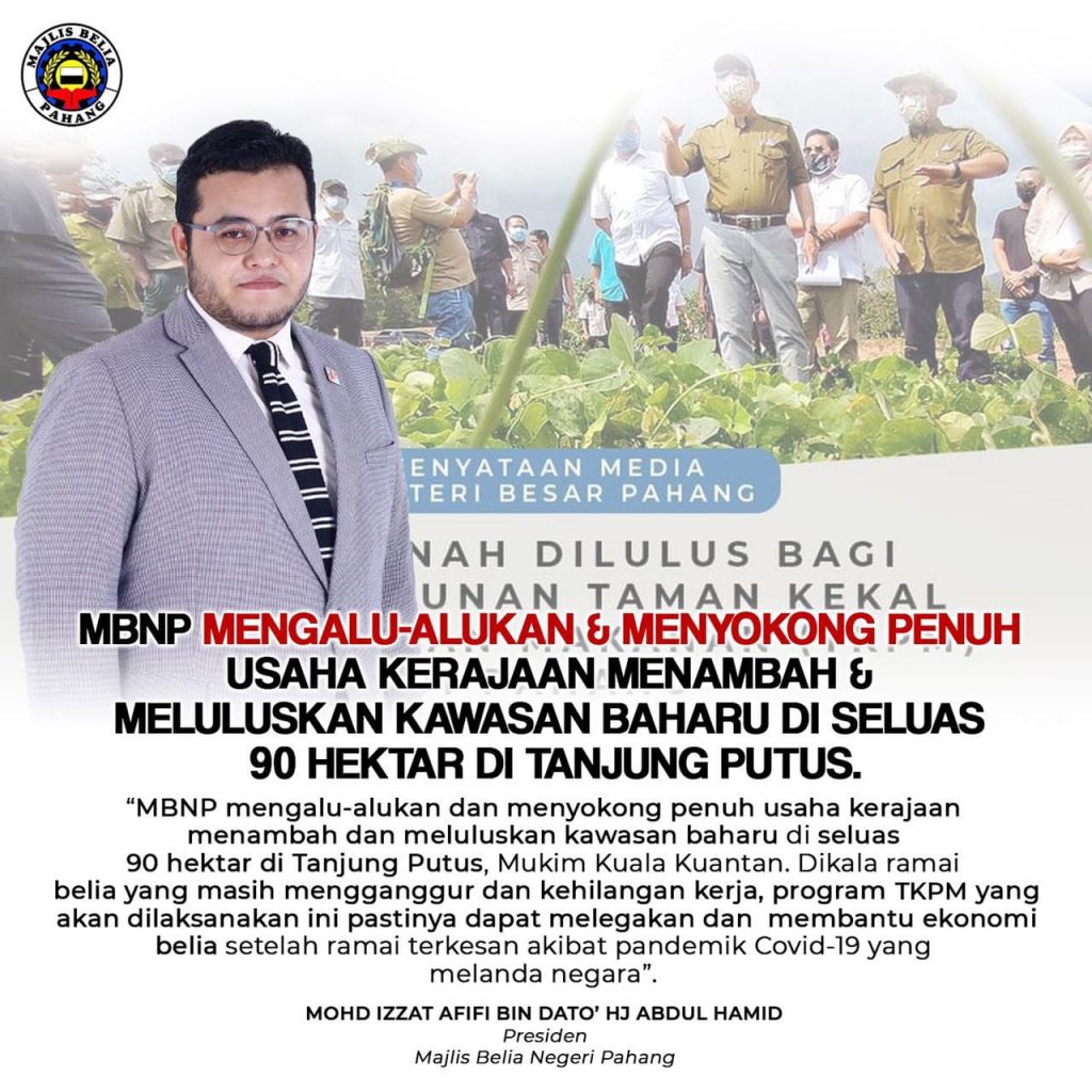 KUANTAN, 17 OKTOBER 2021 : Majlis Belia Negeri Pahang (MBNP) menyokong usaha kerajaan dalam meluluskan kawasan baharu bagi Taman Kekal Pengeluaran Makanan (TKPM) di Tanjung Putus di Mukim Kuala Kuantan seluas 90 hektar.