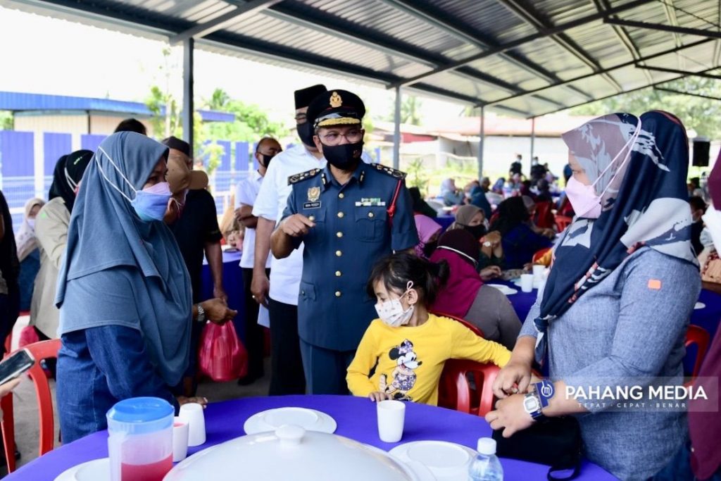 YAB Menteri Besar Pahang, Dato’ Sri Haji Wan Rosdy Wan Ismail bertanya khabar kepada penduduk pada program penyampaian Bantuan Prihatin Pahang kepada seorang kanak-kanak di Sungai Koyan, Lipis, hari ini.