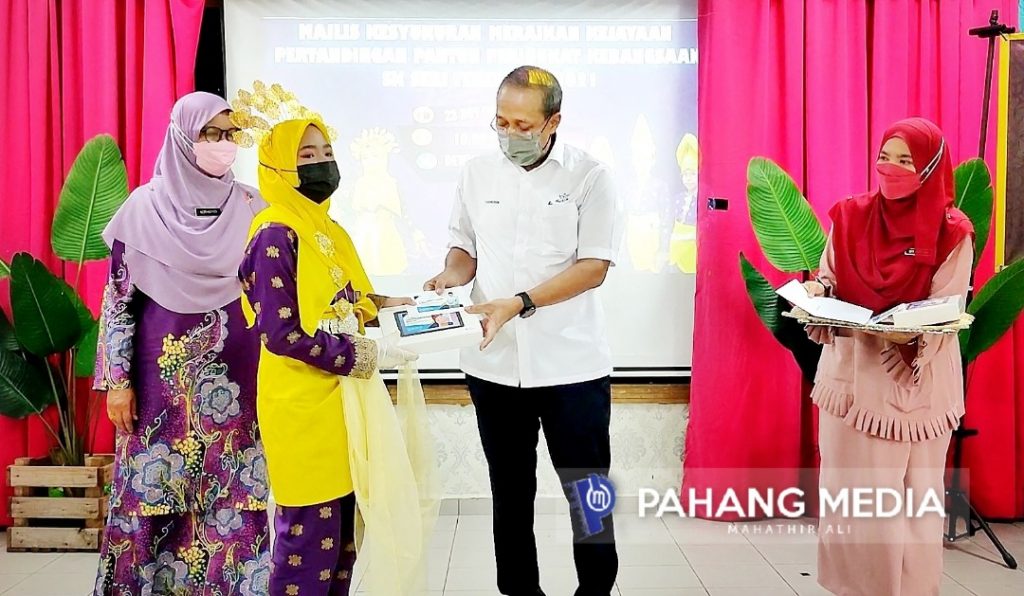 Pengerusi Jawatankuasa Sains, Teknologi, Inovasi, Komunikasi dan Multimedia Negeri Pahang, YB. Dato’ Haji Mohammad Fakhruddin Mohd Ariff menyampaikan hadiah tablet dan wang tunai kepada murid SK Seri Terentang yang berjaya memenangi Pertandingan Pesta Pantun Peringkat Kebangsan Sekolah Rendah 2021 baru-baru ini.