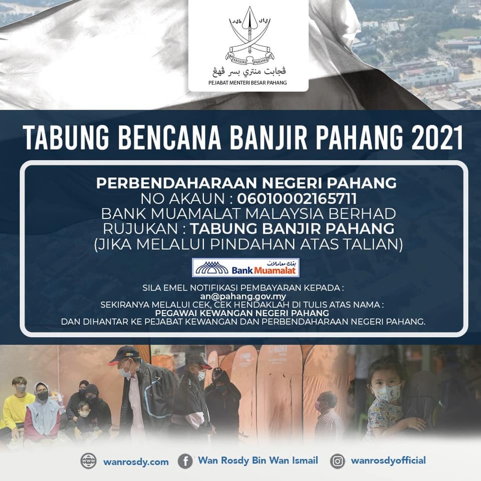 Justeru orang ramai boleh memasukkan sumbangan kepada akaun Bank Muamalat Perbendaharaan Negeri Pahang 06010002165711 dengan rujukan Tabung Banjir Pahang