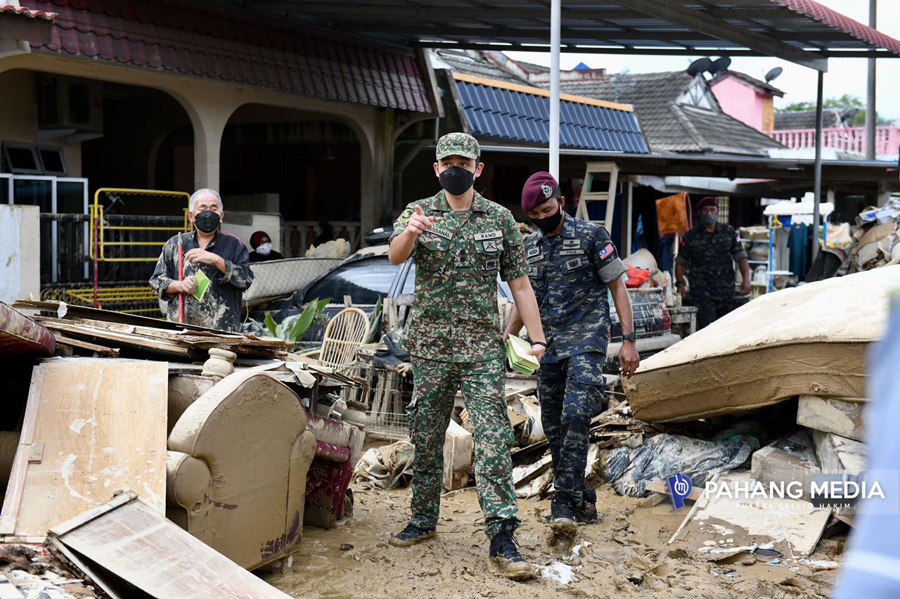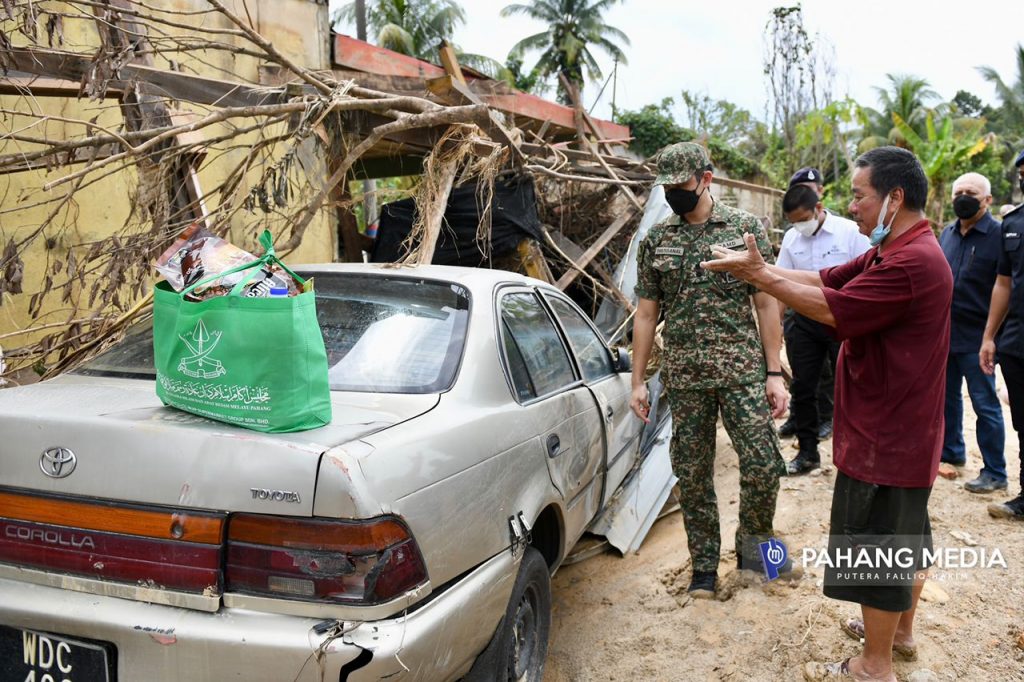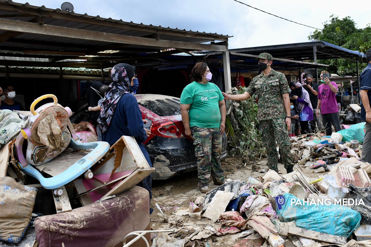 Seterusnya baginda berangkat melihat sendiri kerosakan akibat banjir dan menziarahi mangsa di beberapa kampung, taman perumahan dan PPS di Karak sebelum bercemar duli pula ke Daerah Bera.