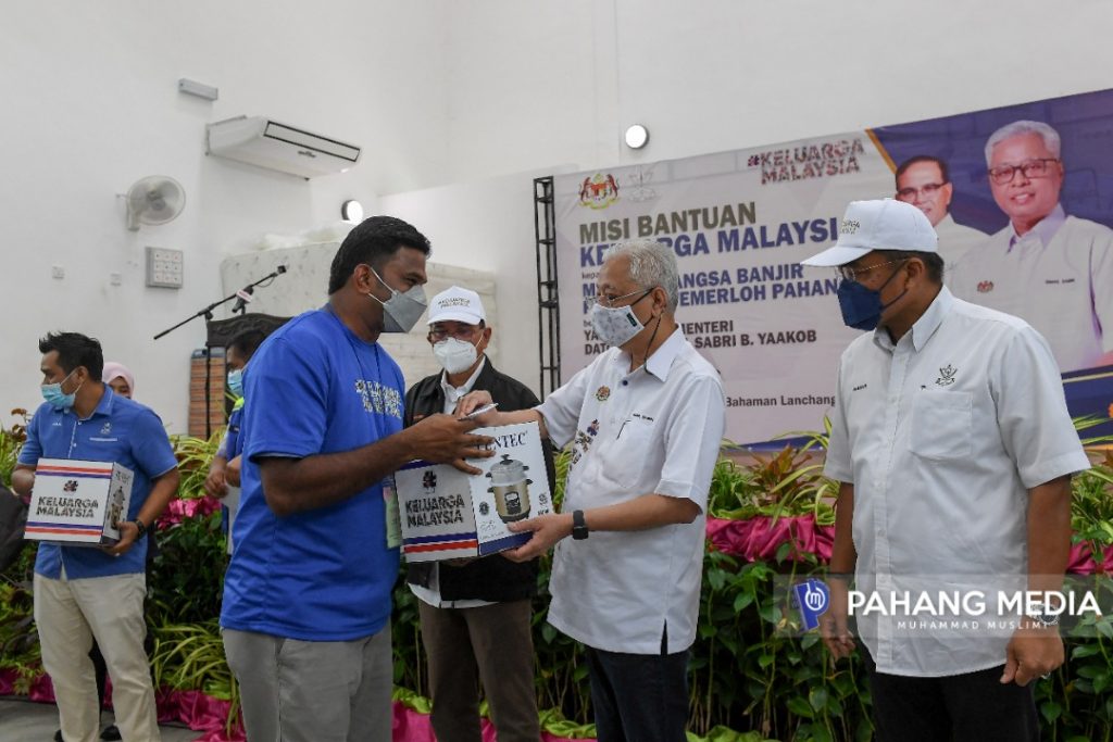 YAB Perdana Menteri, Dato’ Sri Ismail Sabri Yaakob bersama YAB Menteri Besar Pahang, Dato’ Sri Haji Wan Rosdy Wan Ismail menyantuni mangsa banjir di daerah Temerloh pada program Misi Bantuan Keluarga Malaysia Kepada Mangsa Banjir Parlimen Temerloh Bersama YAB Perdana Menteri Malaysia di Dewan Majlis Perbandaran Temerloh (MPT) Lanchang, Temerloh hari ini.