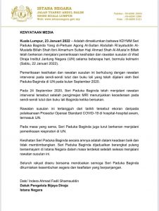 KUANTAN, 23 JANUARI 2022: Kebawah Duli Yang Maha Mulia Seri Paduka Baginda Yang di-Pertuan Agong, Al-Sultan Abdullah Ri’ayatuddin Al-Mustafa Billah Shah Ibni Al-Marhum Sultan Haji Ahmad Shah Al-Musta’in Billah telah berkenan menjalani pemeriksaan kesihatan dan rawatan susulan di Wad Diraja Institut Jantung Negara (IJN) selama beberapa hari bermula semalam.