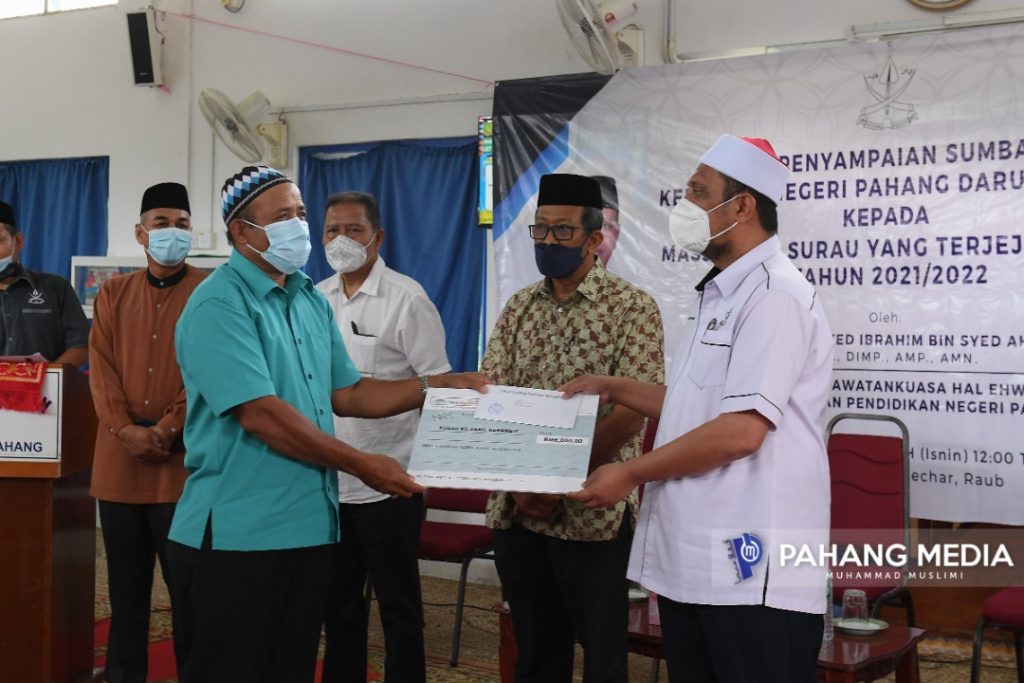 Pengerusi Jawatankuasa Hal Ehwal Agama Islam dan Pelajaran Negeri Pahang, YB. Dato’ Sri Syed Ibrahim Syed Ahmad yang mewakili YAB Menteri Besar Pahang, Dato’ Sri Haji Wan Rosdy Wan Ismail menyampaikan sumbangan kepada Masjid dan Surau Yang Terjejas Banjir Tahun 2021/2022 di Masjid Kampung Lechar, di Raub