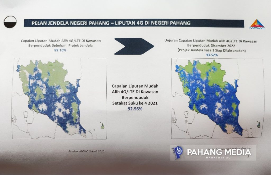 Melalui pelaksanaan JENDELA, kadar liputan 4G di Pahang terus meningkat daripada 89.1% (Suku ke 2 2020 – sebelum JENDELA bermula) kepada 92.56% (Suku 4, 2021).