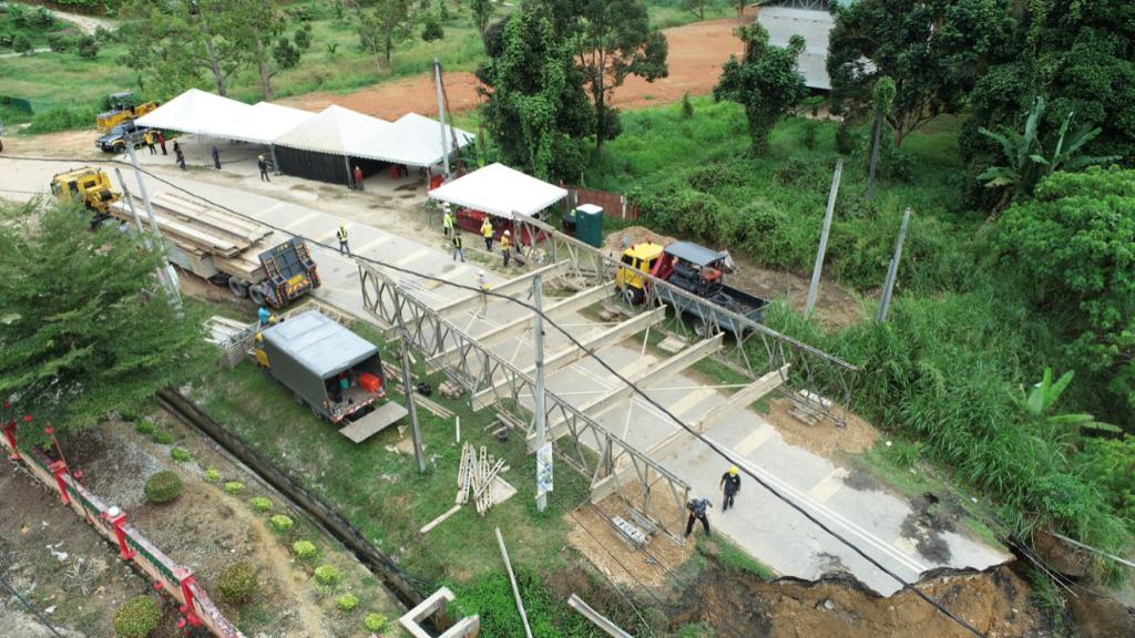RAUB, 27 FEBRUARI 2022 : Kerja-kerja pembinaan jambatan sementara atau Bailey Bridge bagi menyambung jalan utama Raub – Bukit Fraser berdekatan Kampung Tras kini berada di peringkat akhir.