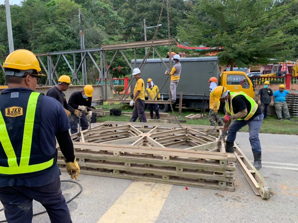 “Kerja-kerja pembinaan oleh tenaga kerja dalaman JKR Pahang dengan kekuatan seramai 38 anggota yang komited menyiapkan jambatan ini bagi kemudahan pengguna.