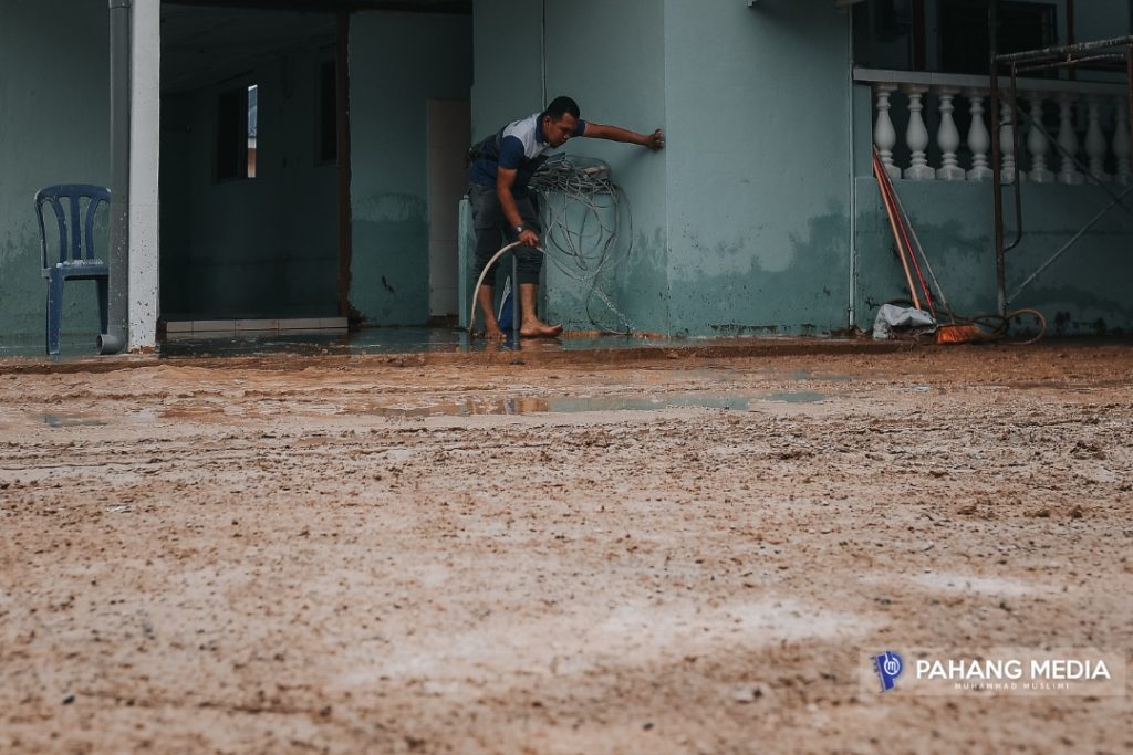 Seorang penduduk Kampung Benus, Bentong sedang membersihkan surau yang dilanda banjir kilat hari ini.