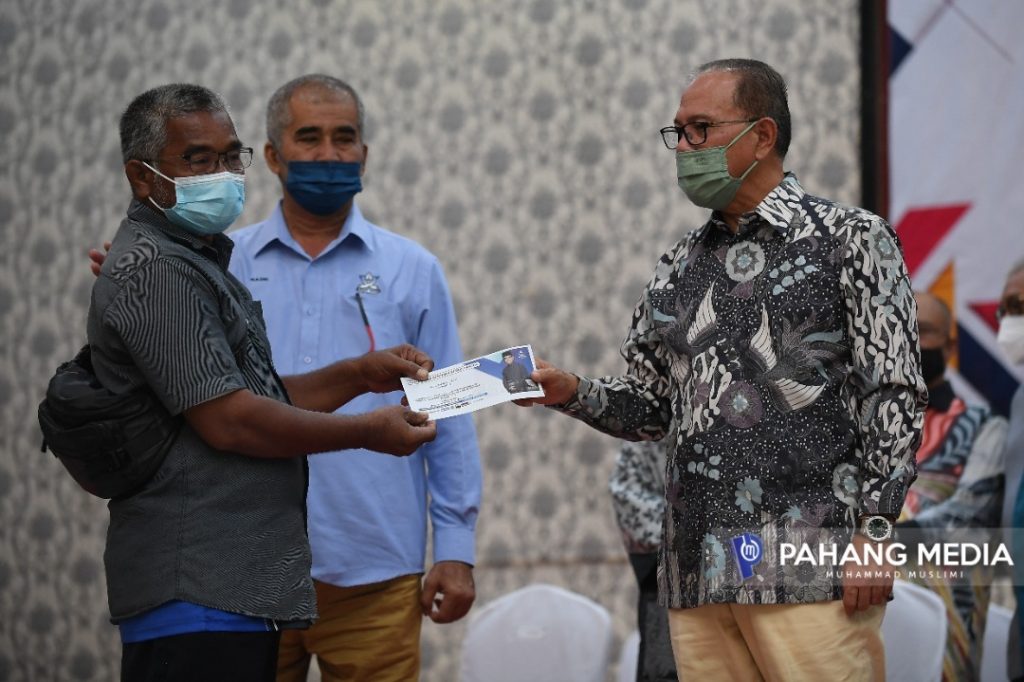 YAB Menteri Besar Pahang, Dato' Sri Haji Wan Rosdy Wan Ismail menyerahkan cek sumbangan Kerajaan Negeri kepada Encik Bakri Yasan, 58, dari Kampung Gintong