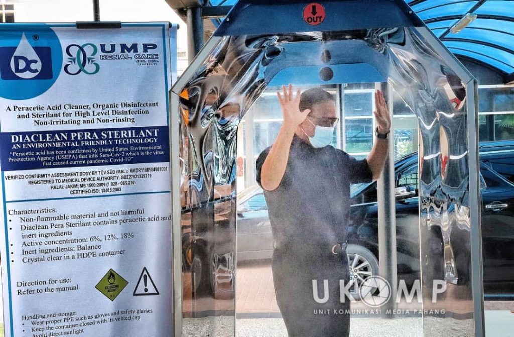 Kotak Laluan Nyah Kuman diberi nama D’Perang itu ditaja oleh PahangGo Sdn Bhd dan ianya menggunakan ‘Diaclean Pera Sterilant’ yang mengandungi peracetic acid sebagai bahan aktif yang mematuhi piawaian Pertubuhan Kesihatan Sedunia (WHO) dan United States Environmental Protection Agency (USEPA) sebagai antara bahan yang mampu membunuh virus termasuk Covid-19 malah ianya mengandungi bahan yang halal dan bebas kandungan aldehyde serta alkohol. Produk ini merupakan kalobrasi antara PahangGo dan UMP Renal Care.