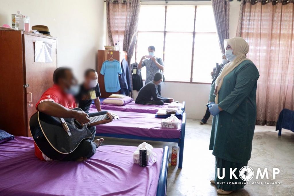 Pengerusi Jawatankuasa Kebudayaan, Perpaduan, Kebajikan Masyarakat, Pembangunan Wanita dan Keluarga Negeri Pahang, YB. Dato’ Sri Hajah Shahaniza Shamsuddin melihat salah seorang gelandangan mempamirkan bakatnya bermain gitar ketika melihat kelengkapan dan kemudahan yang disediakan untuk golongan itu di Pusat Perlindungan Sementara Gelandangan di Institut Latihan KEMAS Kuantan, hari ini.