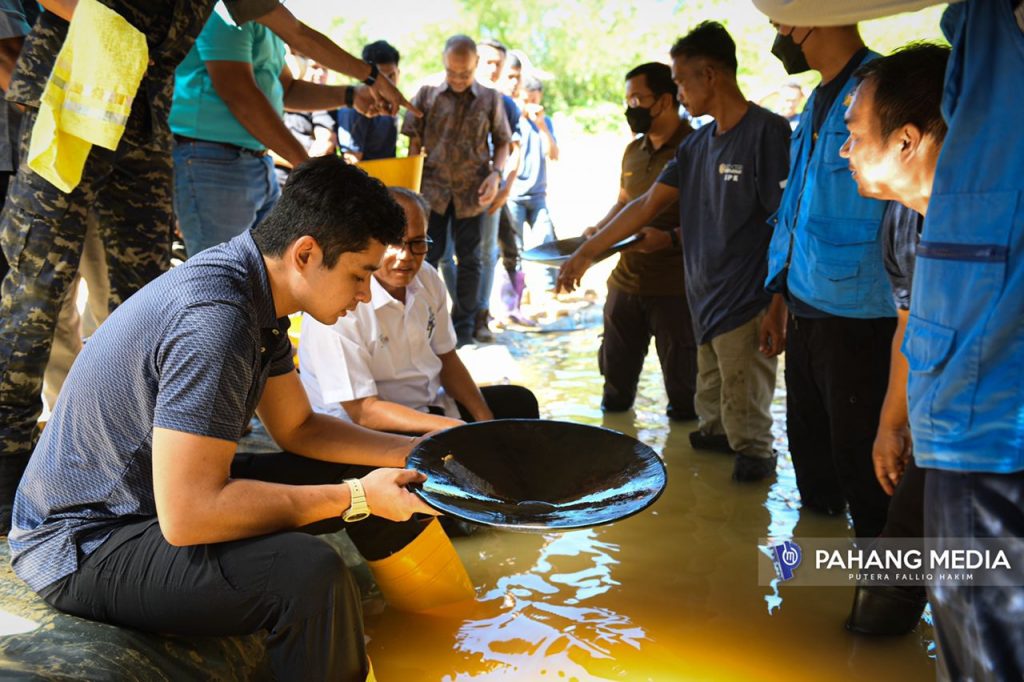KDYMM Pemangku Raja Pahang Tengku Mahkota Tengku Hassanal Ibrahim Alam Shah Ibni Al-Sultan Abdullah Ri’ayatuddin Al-Mustafa Billah Shah berkenan mencuba teknik mendulang emas ketika baginda berangkat ke Kampung Dada Kering untuk melawat dan mendengar taklimat berkenaan Skim Pelombong Kecil, di Lipis hari ini.