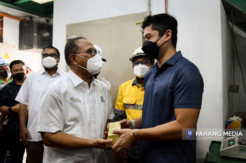 KDYMM Pemangku Raja Pahang Tengku Mahkota Tengku Hassanal Ibrahim Alam Shah Ibni Al-Sultan Abdullah Ri’ayatuddin Al-Mustafa Billah Shah bersama YAB Menteri Besar Pahang Dato’ Sri Haji Wan Rosdy Wan Ismail memegang jongkong emas ketika baginda berangkat melawat lombong emas di Bukit Selinsing, Lipis hari ini.