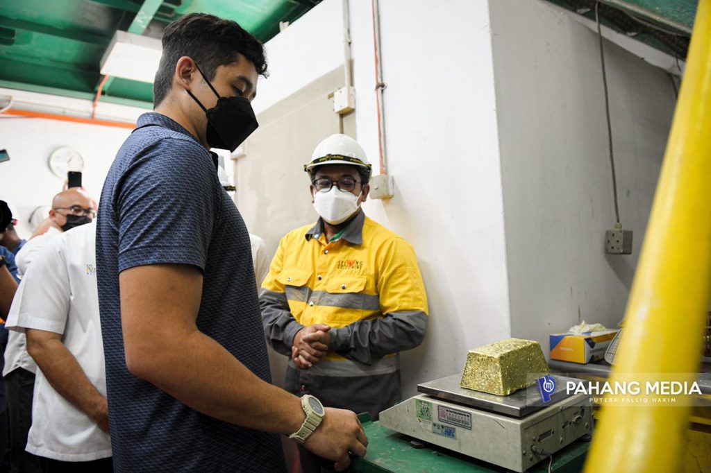 KDYMM Pemangku Raja Pahang Tengku Mahkota Tengku Hassanal Ibrahim Alam Shah Ibni Al-Sultan Abdullah Ri'ayatuddin Al-Mustafa Billah Shah berkenan melihat jongkong emas ketika baginda berangkat melawat lombong emas di Bukit Selinsing, Lipis hari ini.