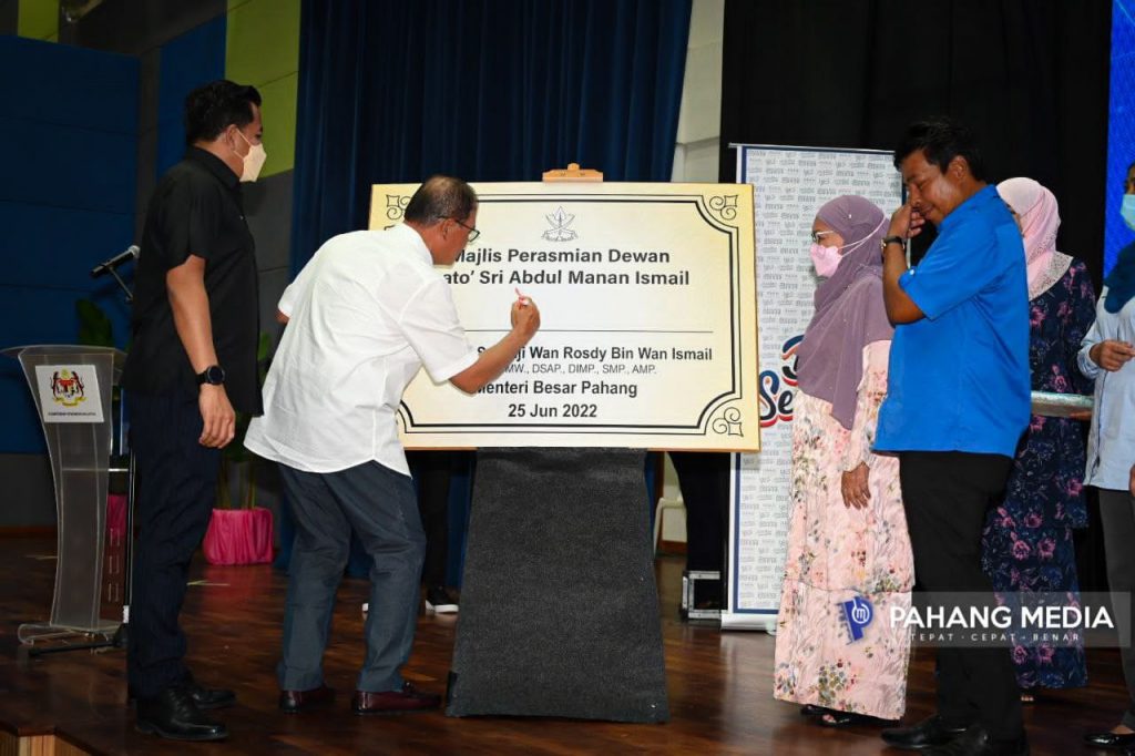 KUANTAN, 25 JUN 2022 : YAB Menteri Besar Pahang, Dato’ Sri Haji Wan Rosdy Wan Ismail merasmikan dewan baharu di Parlimen Paya Besar dan dinamakan Dewan Dato’ Sri Abdul Manan Ismail sebagai mengenang jasa kepimpinan berjiwa rakyat oleh mantan Ahli Parlimen itu.