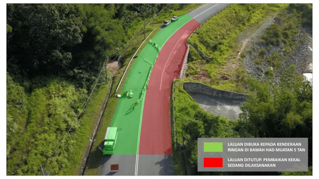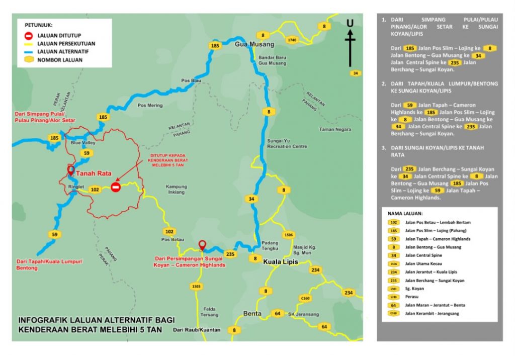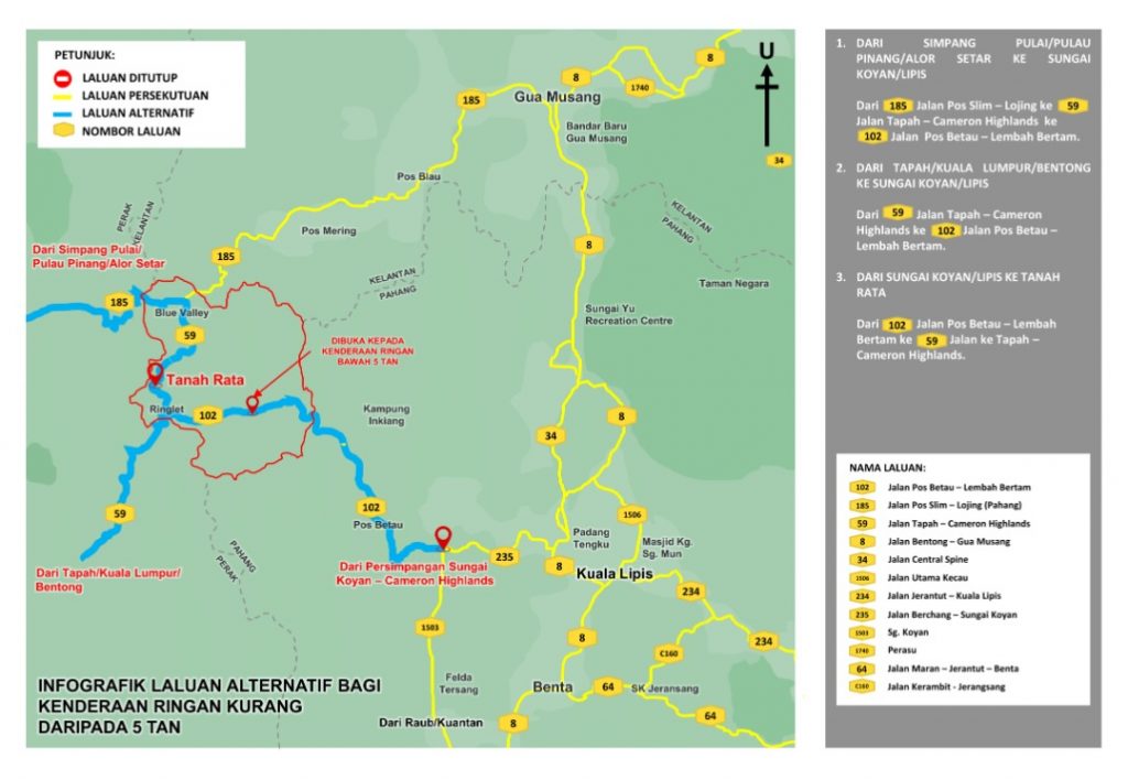 Menurut kenyataan yang dikeluarkan oleh Jabatan Kerja Raya (JKR) Cameron Highlands hari ini, laluan tersebut hanya boleh dilalui oleh kenderaan ringan dibawah 5 tan sahaja.