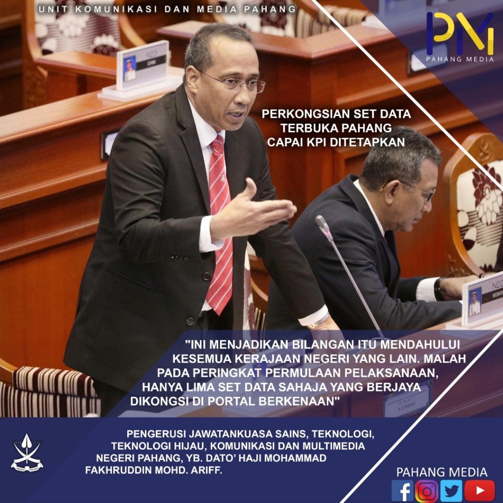 Pengerusi Jawatankuasa Sains, Teknologi, Teknologi Hijau, Komunikasi dan Multimedia Negeri Pahang, YB. Dato’ Haji Mohammad Fakhruddin Mohd. Ariff berkata, pada tahun 2018, bilangan set data yang dikongsi meningkat kepada 111 set atau 222 peratus.