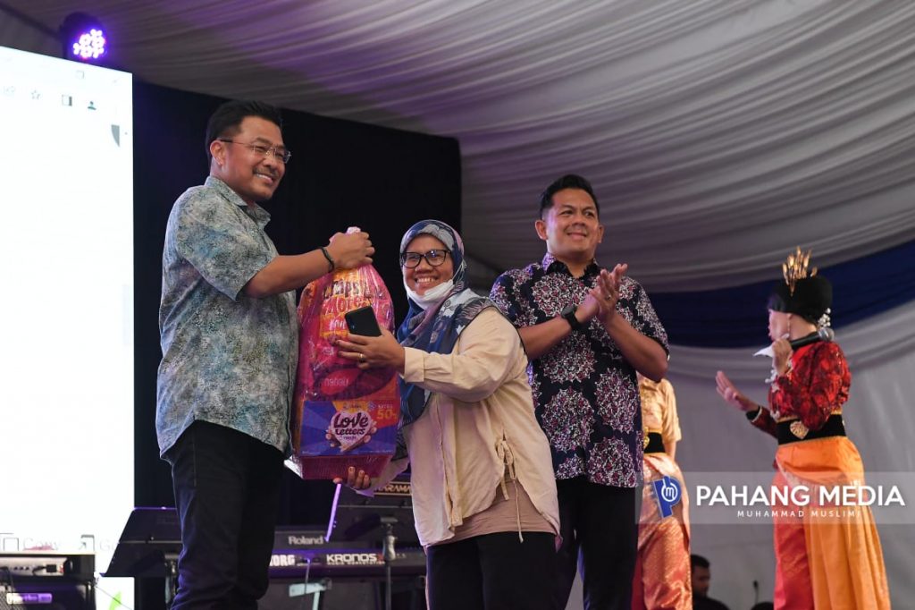 Pengerusi Jawatankuasa Pelancongan, Kebudayaan, Alam Sekitar, Perladangan dan Komoditi Negeri Pahang, YB. Dato’ Sri Mohd. Sharkar Shamsudin menyampaikan hadiah kepada seorang pemenang pada Malam Alam Sekitar Sempena Dialog Paya Besar 2022 di Anjung Sungai Lembing, Kuantan, malam tadi.